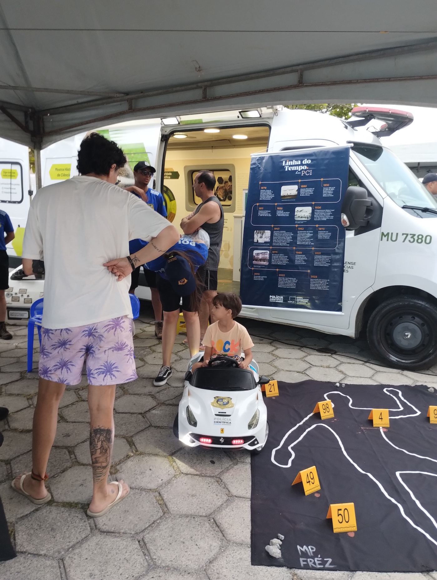 Entre os destaques estão a viatura expositiva, onde os visitantes podem entrar e conhecer de perto equipamentos utilizados pela perícia, e a arqueologia forense, com uma escavação lúdica que permite ao público simular a localização de ossos, utilizando protótipos educativos.