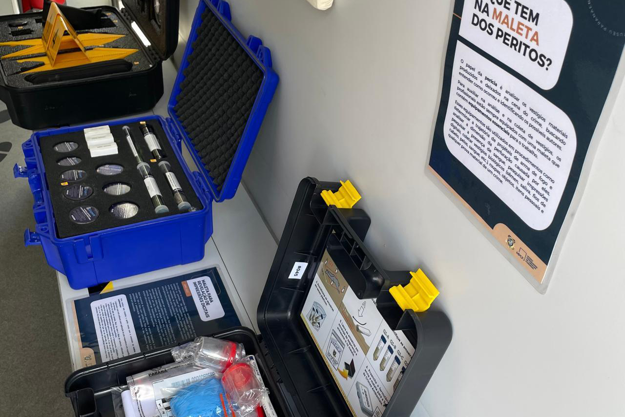 O público também pode conhecer de perto a coleta de impressões digitais no local do crime. Outro destaque é a documentoscopia, com equipamentos que permitem visualizar elementos de segurança em documentos e identificar possíveis falsificações, além da entomologia forense, área que utiliza insetos como bioindicadores para estimar o intervalo pós-morte.