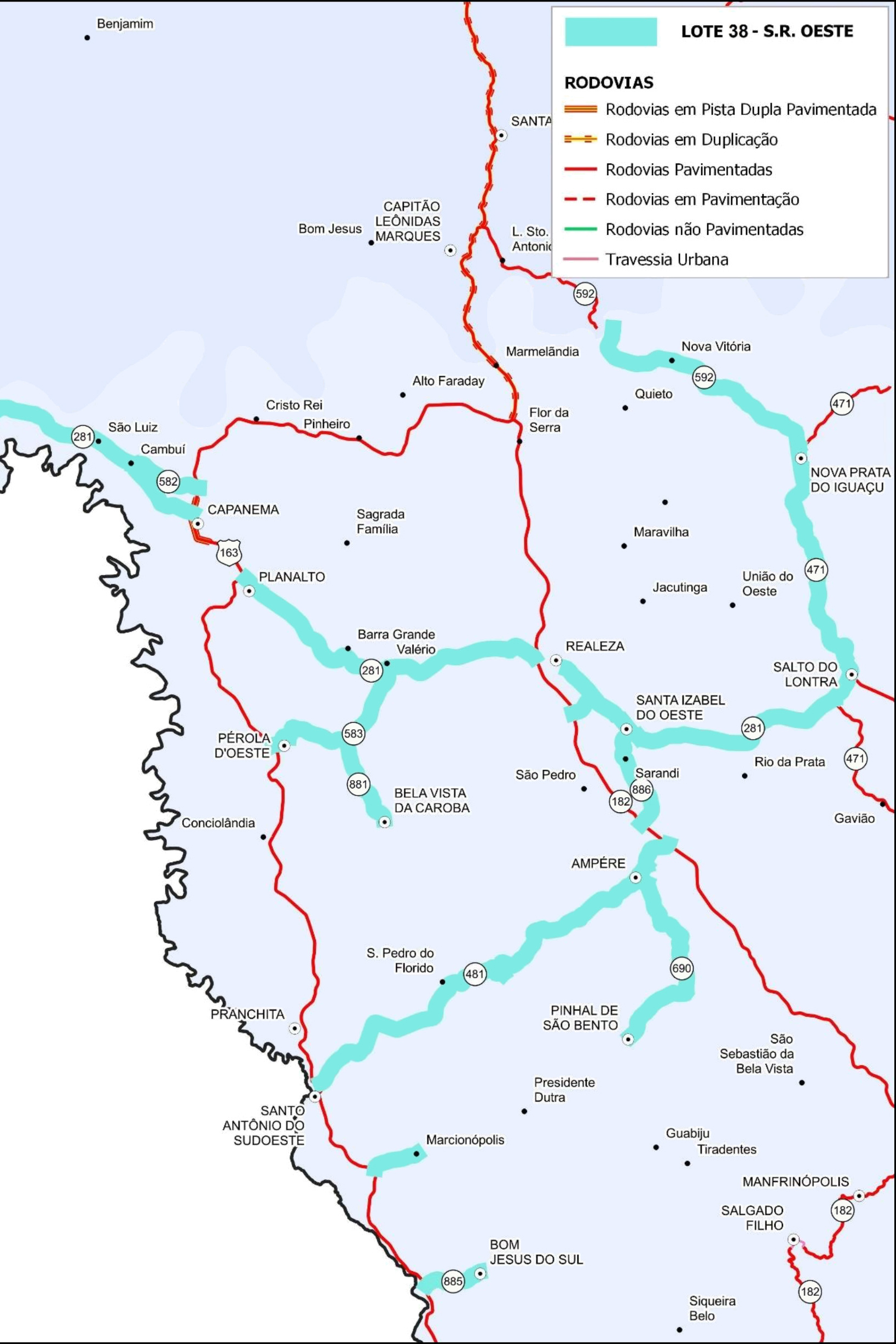 Estão contemplados trechos da PR-281, PR-471, PR-481, PR-582, PR-583, PR-592, PR-690, PR-880, PR-881, PR-883, PR-885, PR-886 e PR-889, cruzando os territórios dos municípios de Ampére, Bela Vista da Caroba, Bom Jesus do Sul, Capanema, Nova Prata do Iguaçu, Pérola d'Oeste, Pinhal de São Bento, Planalto, Realeza, Salto do Lontra, Santa Izabel do Oeste e Santo Antônio do Sudoeste.