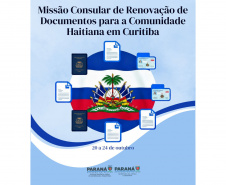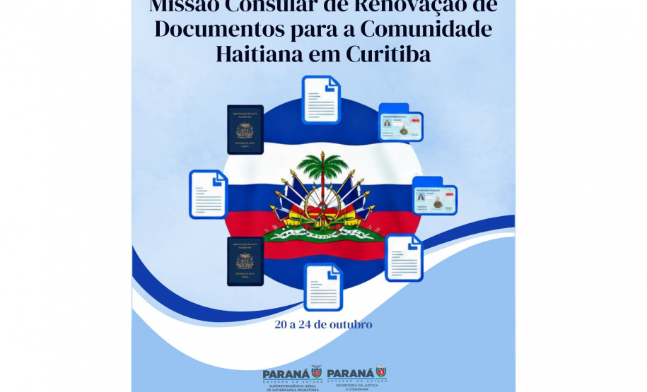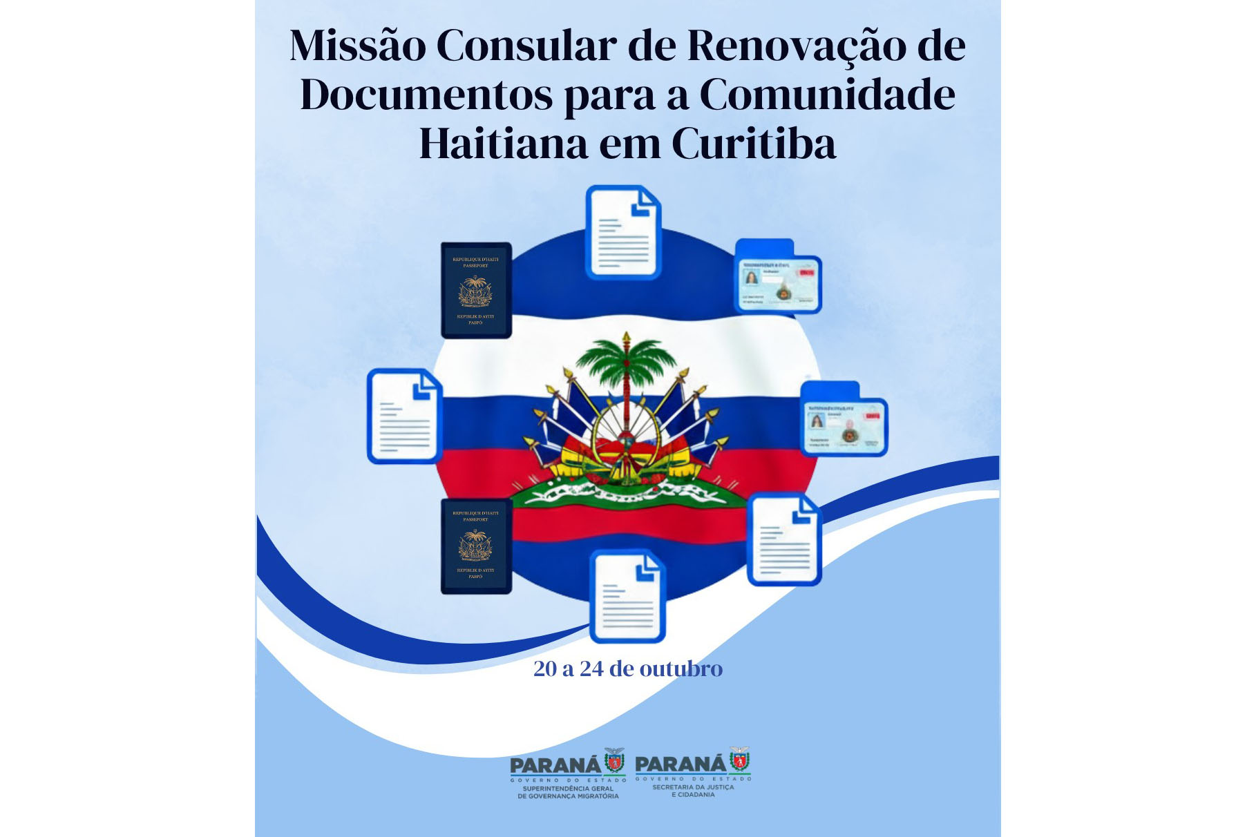 A Embaixada do Haiti, em parceria com o Governo do Estado, por meio da Superintendência-Geral de Governança Migratória da Secretaria da Justiça e Cidadania (Seju), realizará em Curitiba uma missão consular para emissão e renovação de documentos entre os dias 20 a 24 de outubro (segunda a sexta-feira), das 9h às 17h. A ação é voltada à comunidade migrante haitiana e os atendimentos serão na Rua Marechal Deodoro, 806, no centro de Curitiba.