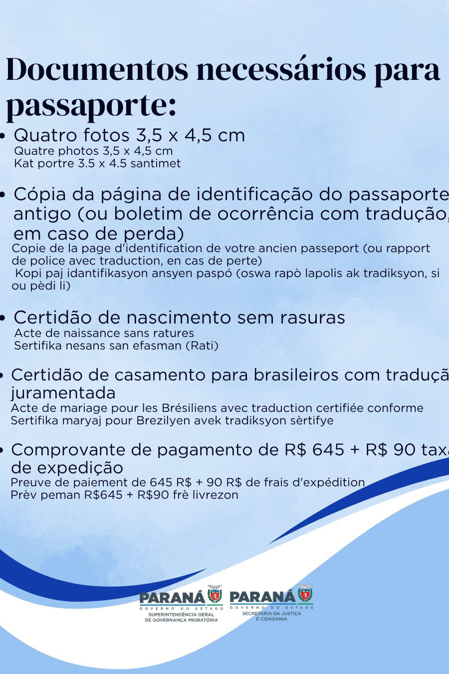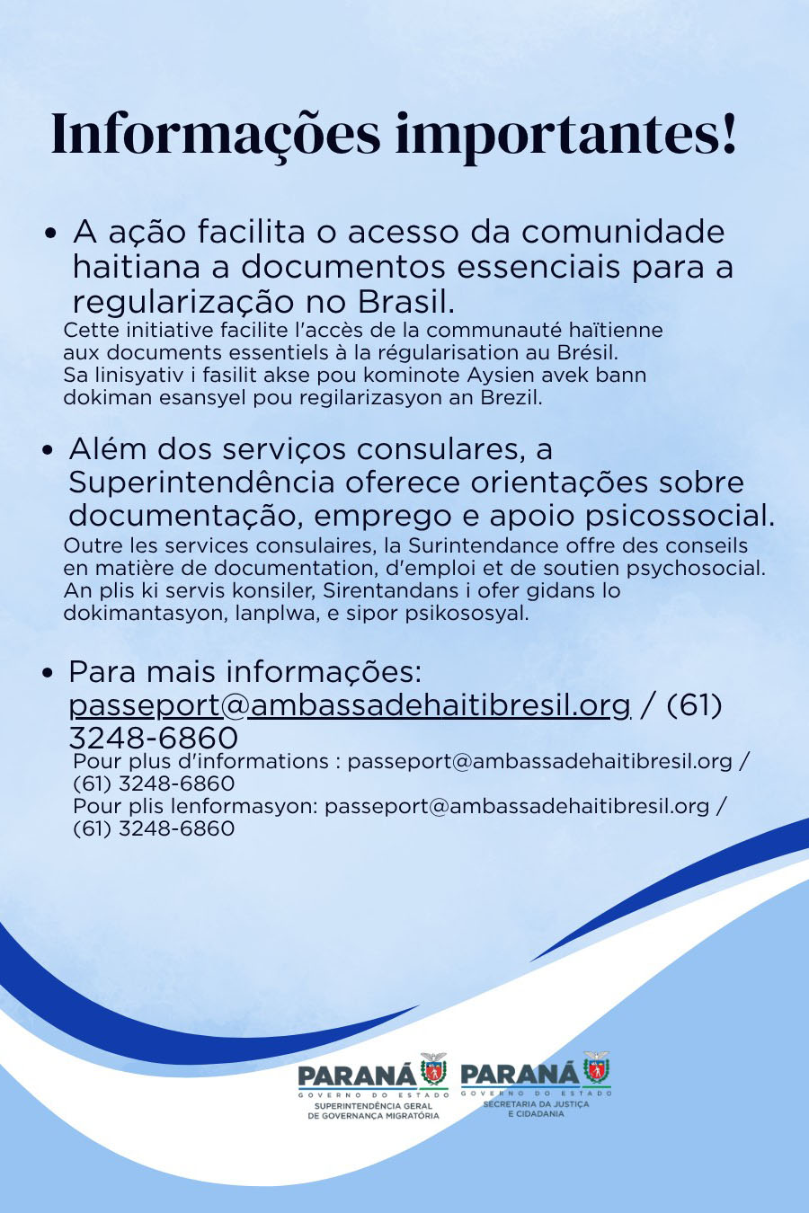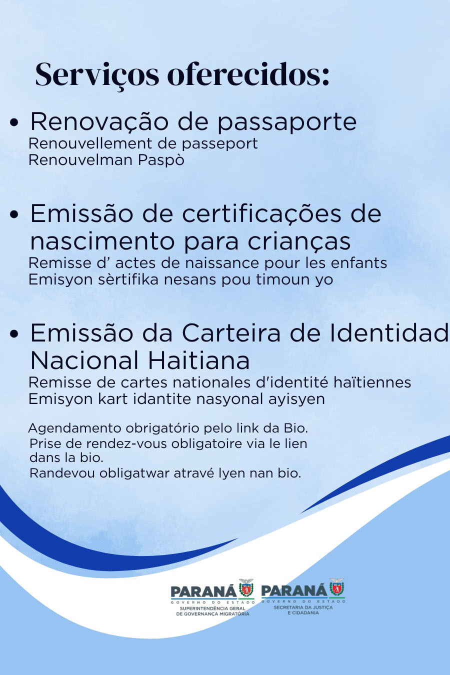 “Para o migrante haitiano que mora na região metropolitana de Curitiba, é uma oportunidade imperdível, porque serão ofertados serviços que só são oferecidos em Brasília pela embaixada do Haiti, como renovação de passaporte emissão de certificado de nascimento para crianças a Carteira de Identidade Nacional Haitiana”, ressalta Gil Souza, Superintendente-Geral de Governança Migratória.