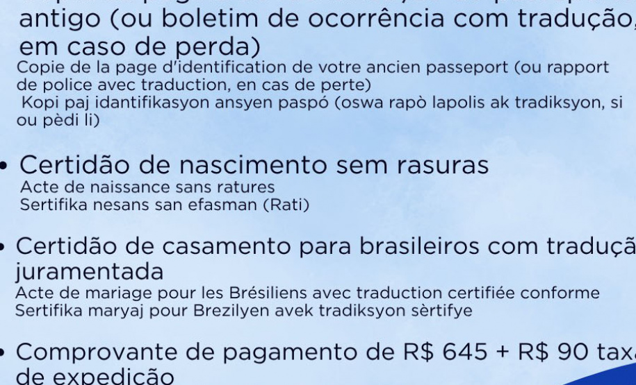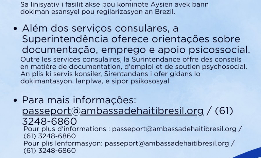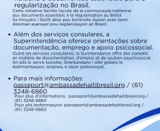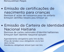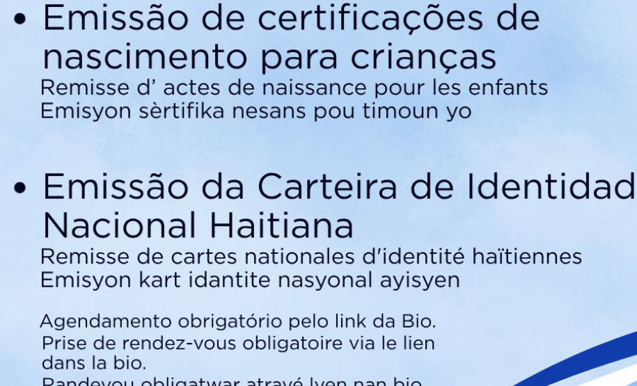 Durante o período, serão oferecidos serviços consulares como renovação de passaporte, certidão de nascimento para crianças, além da emissão da Carteira de Identidade Nacional Haitiana.