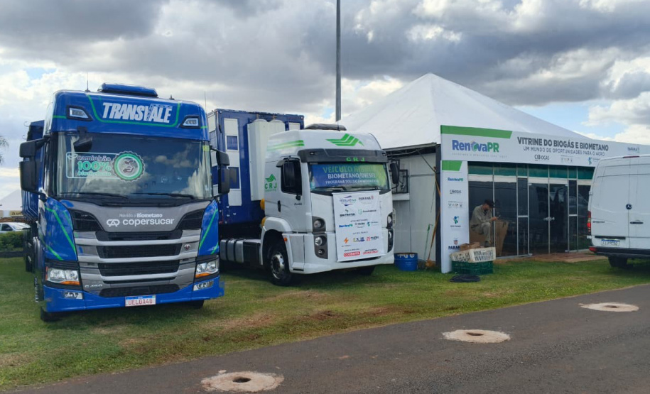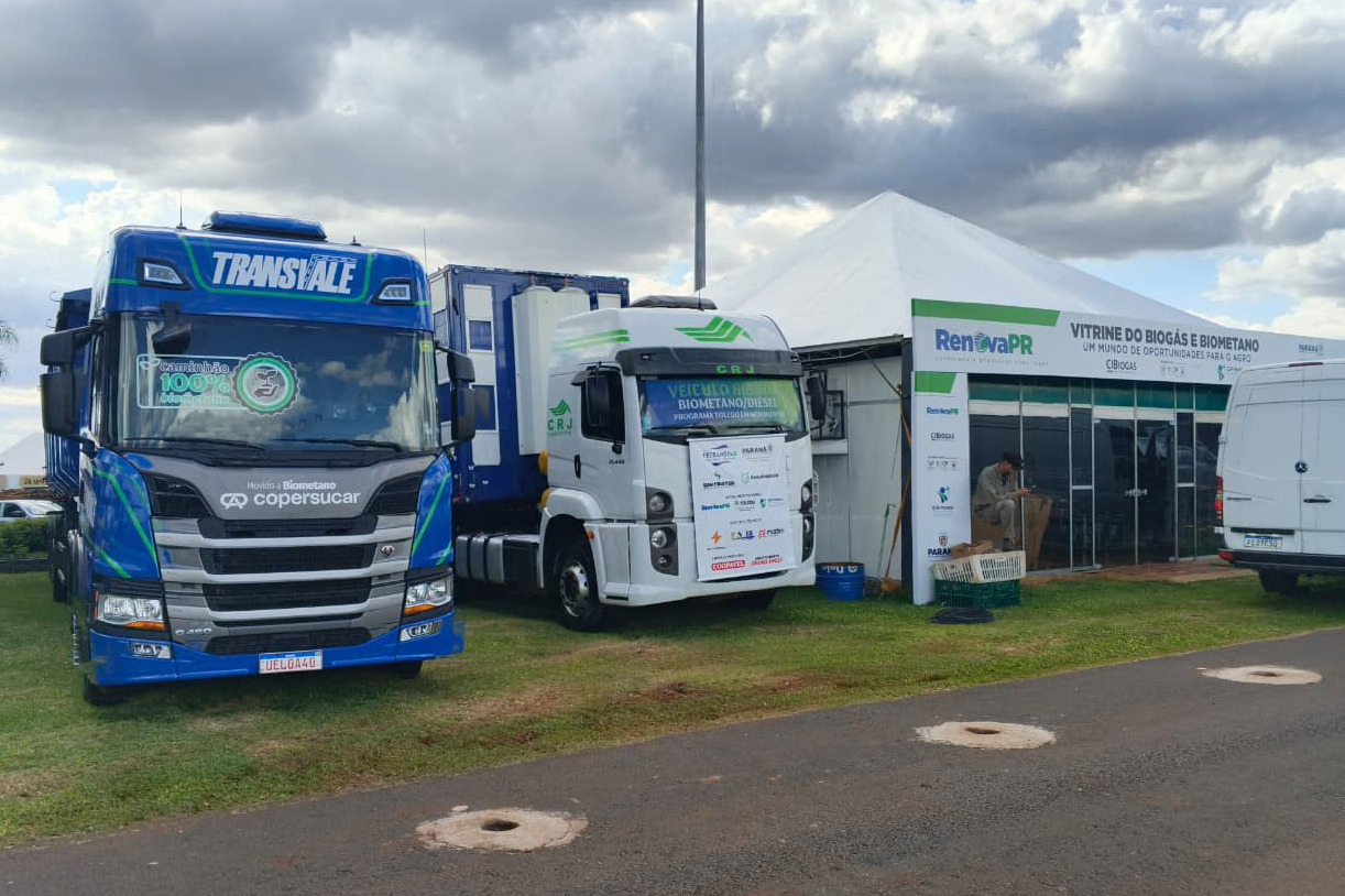EXPOSIÇÃO – Dois caminhões a biometano que já operam no transporte rodoviário, tanto de animais como em longa distância, serão atração na parte externa do espaço. Os caminhões são respectivamente da Transportadora TransVale, que possui sede em Cascavel, e da CRJ Logística, de Toledo. Os visitantes poderão obter informações dos valores de investimento para adequação dos caminhões, economia no consumo, desempenho e redução de emissões.