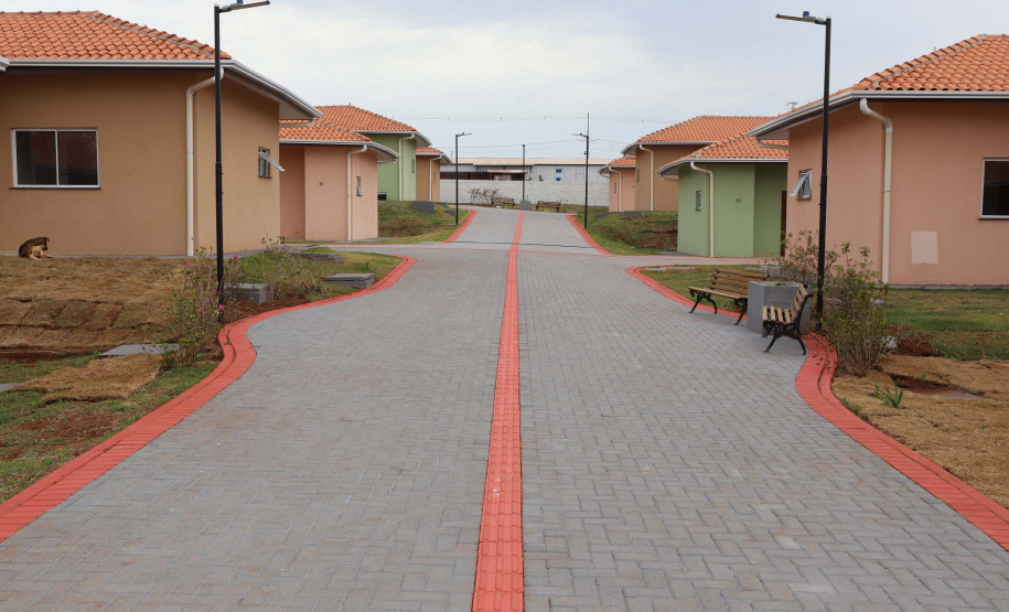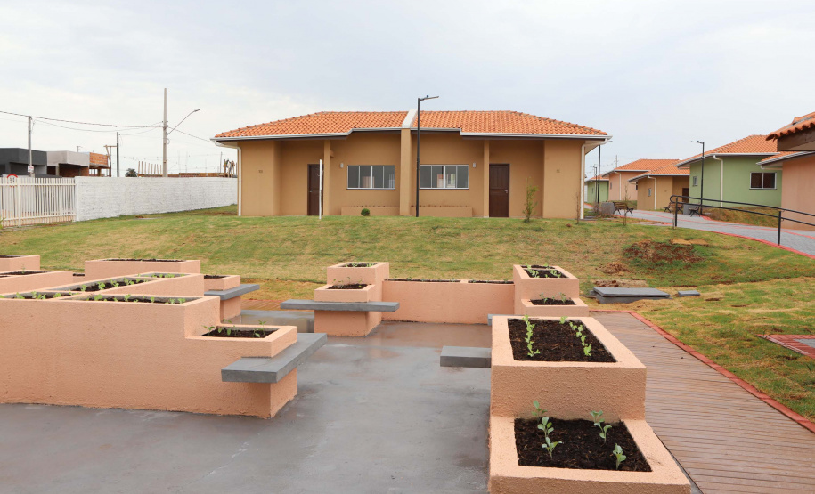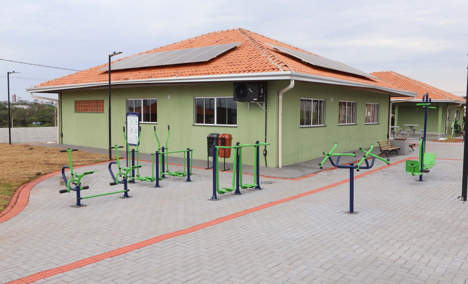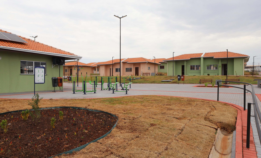 EMPREENDIMENTO – O Condomínio do Idoso de Campo Mourão conta com 40 casas de 43,81 metros quadrados, todas adaptadas para Pessoas com Deficiência (PcD). Cada unidade possui um quarto, sala, cozinha, banheiro e área de serviço externa. A zona comum do empreendimento possui piscina, ambulatório, praça, academia ao ar livre, horta comunitária elevada, salão de festas com painéis solares e quiosques de jogos.