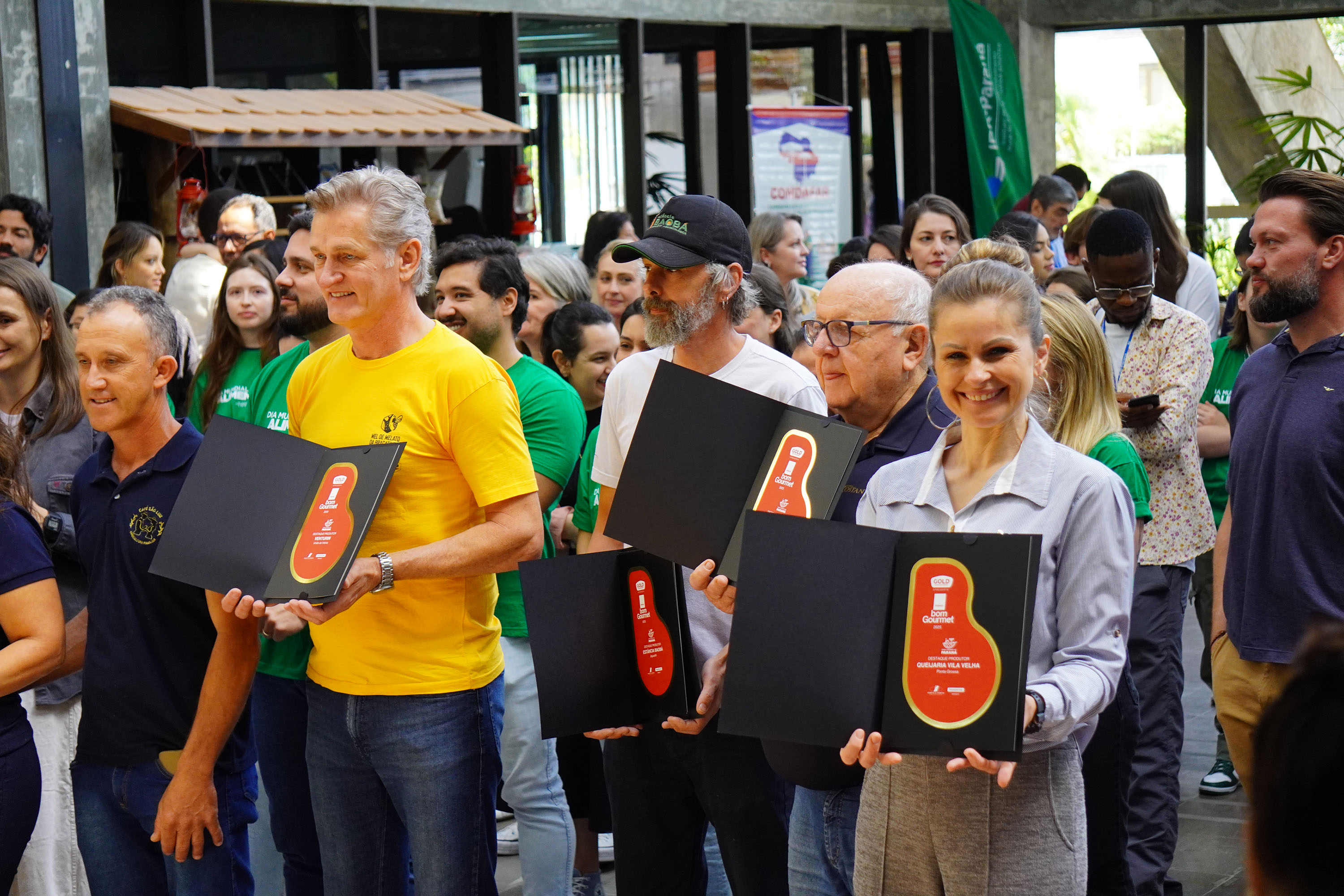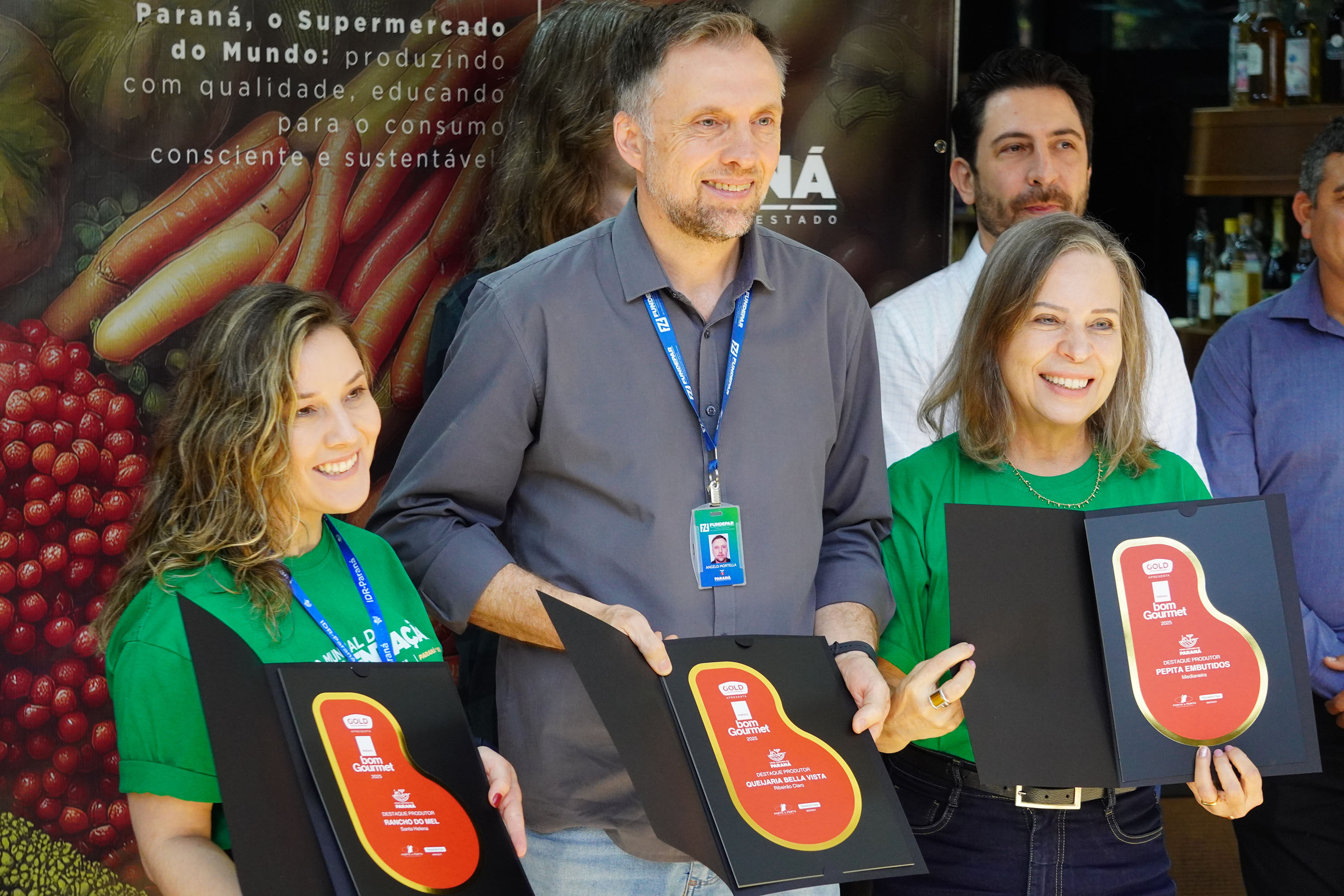 CERTIFICAÇÃO – Também foram entregues 10 certificados do Prêmio Bom Gourmet, em uma homenagem às agroindústrias que contribuem para o fortalecimento da produção em todo o Estado, da segurança alimentar e da valorização da gastronomia paranaense. Os produtores que receberam o prêmio foram selecionados com base na avaliação durante a Feira Sabores do Paraná 2025.