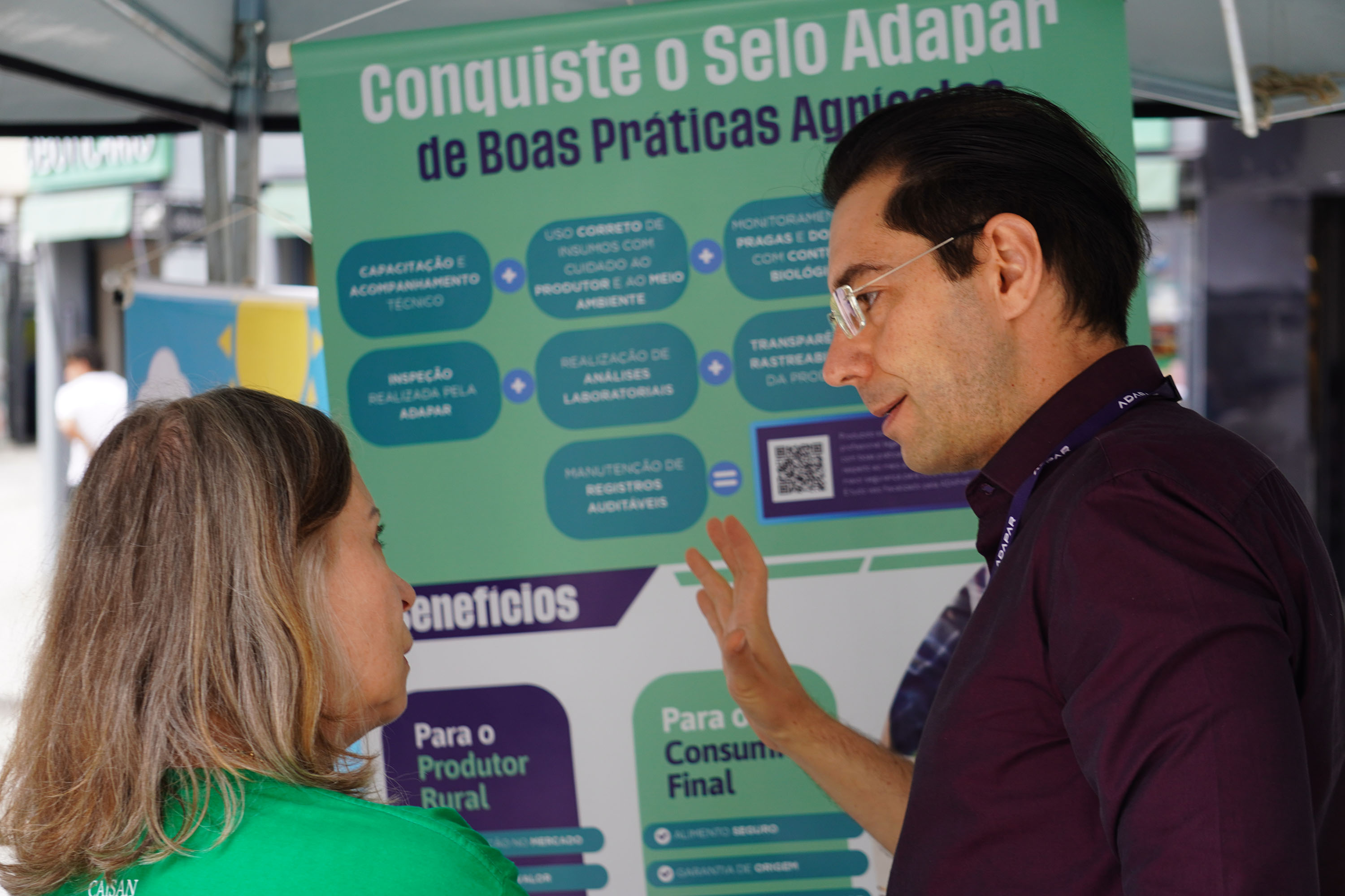 SELO ADAPAR – Servidores da Adapar atenderam a população com banners educativos, mostrando como funciona a certificação da produção, desde o acompanhamento técnico, o uso racional dos insumos agrícolas, as inspeções, as coletas de amostras para análise de resíduos e todo o processo que permite que o produtor utilize o Selo Adapar de Boas Práticas Agrícolas, possibilitando a diferenciação e valorização do produto.
