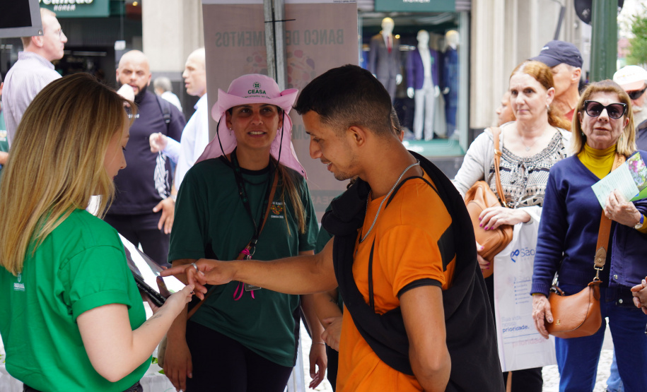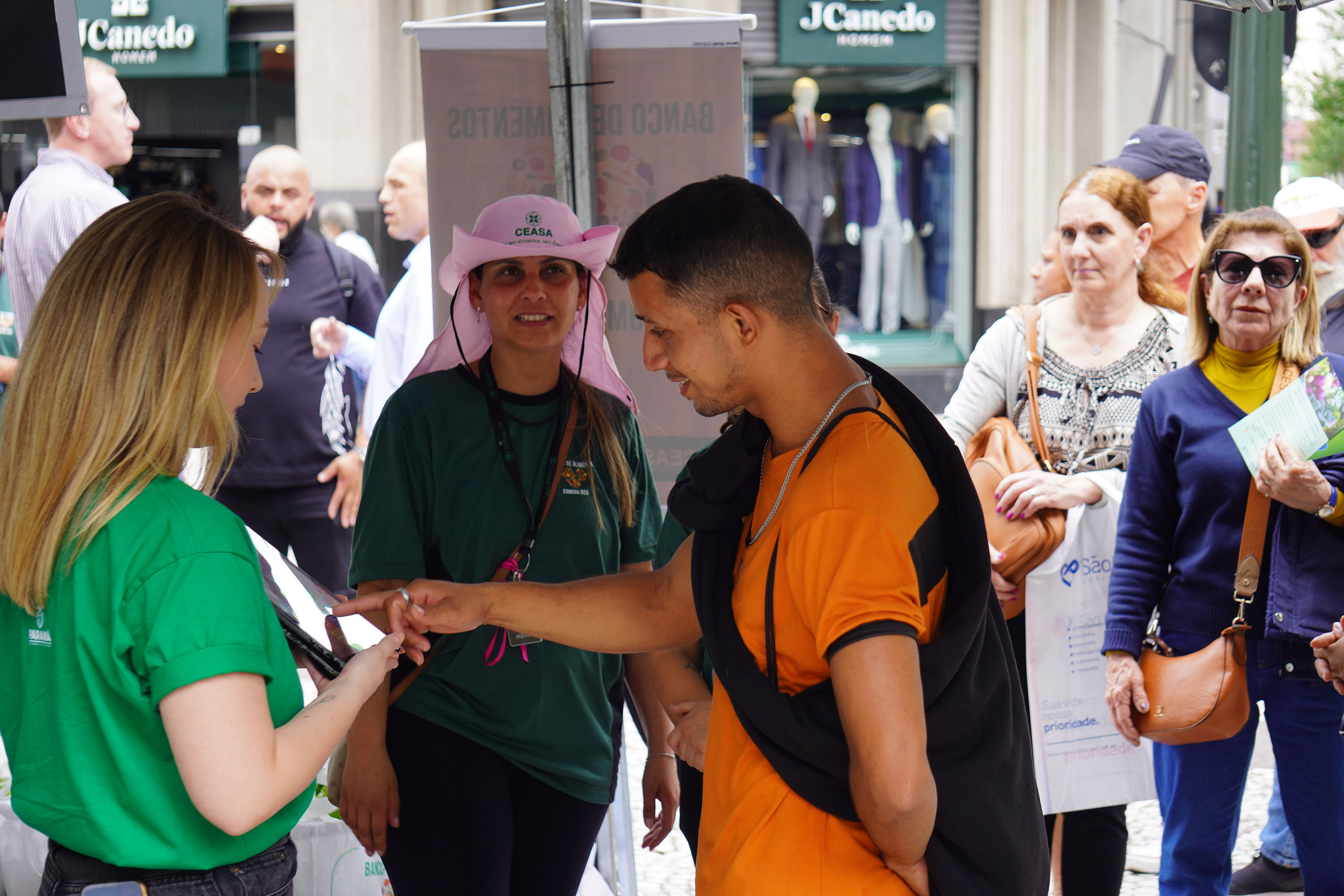 BANCO DE ALIMENTOS – A equipe das Ceasa esteve em contato direto com os cidadãos. Uma das atividades realizadas foi a apresentação do programa Banco de Alimentos, que tem o objetivo de promover o abastecimento e o acesso à alimentação complementar para pessoas em vulnerabilidade social, nutricional e instituições sociais. O propósito é arrecadar e distribuir gratuitamente alimentos não comercializados no atacado ou fora de padrão, mas ainda em condições próprias de consumo.