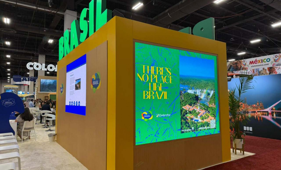 O estande brasileiro é da Embratur, a agência brasileira de promoção internacional do turismo. No espaço, a cidade de Foz do Iguaçu, a Terra das Cataratas, é apresentada como destino destaque, com fotos que representam o turismo local.